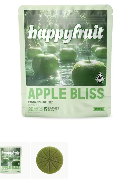 Happy Fruit - Edible - 5pk - Apple Bliss - 100mg is a high-dose indica gummy designed for deep relaxation. Each gummy contains 100mg of THC, providing a calming effect that is ideal for nighttime use. The gummies are made with real fruit puree, ensuring they are 100% vegan and gluten-free. They are infused with rosin, which enhances the rich, full-spectrum flavor and offers a body-forward experience. Users can expect strong full-body relaxation and a sedating unwind, making them suitable for those seeking a serious wind-down.